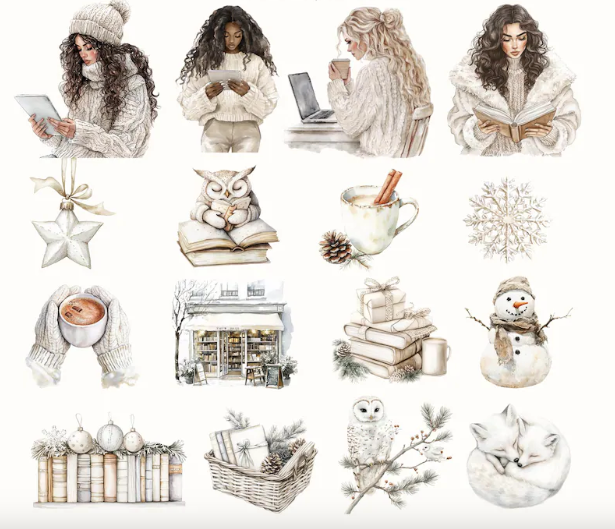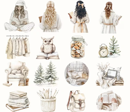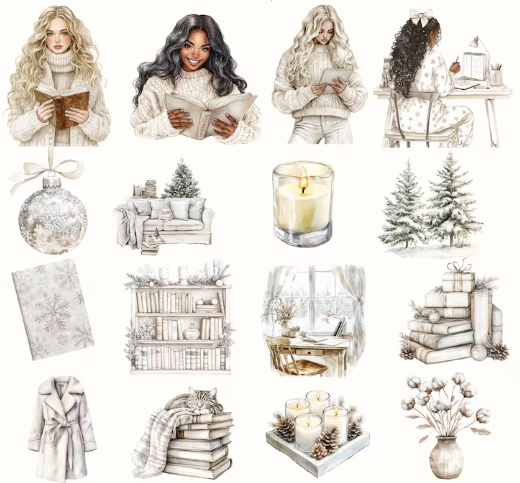 This Winter Planner Clipart Bundle is a dream for every planner enthusiast! Featuring stylish women in cozy Christmas sweaters, elegant frosty-themed planner elements, and cute decorative elements, this set is perfect for decorating your winter planners or digital journals.